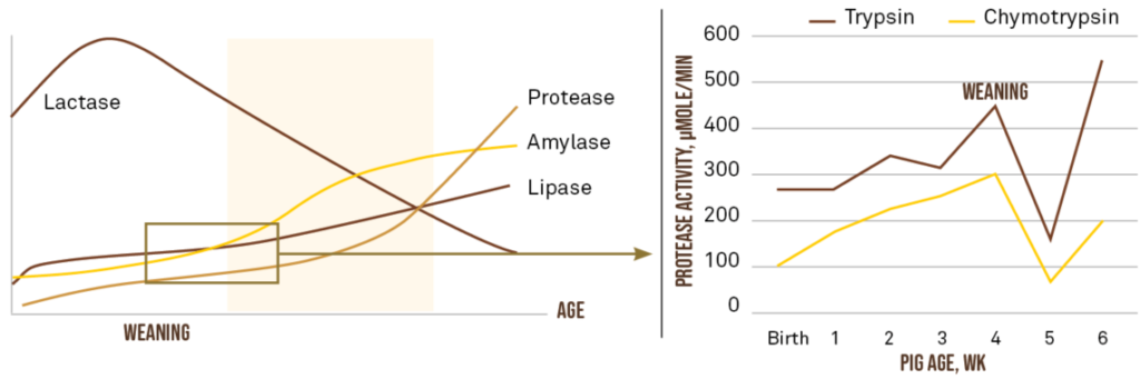 Around weaning, the piglet’s own production of enzymes for the digestion of starch, lipid and especially protein is not sufficiently developed (Figure 2). Due to this weaning dip in e.g. protease synthesis, it’s very important to focus on well-digestible proteins in the diet during this sensitive age period.